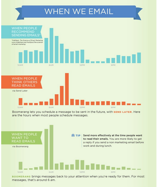 Interestingly, the times we think people read emails and the times they actually do are completely different. Boomerang for Gmail even conducted a study from over 100 million emails to prove it.
